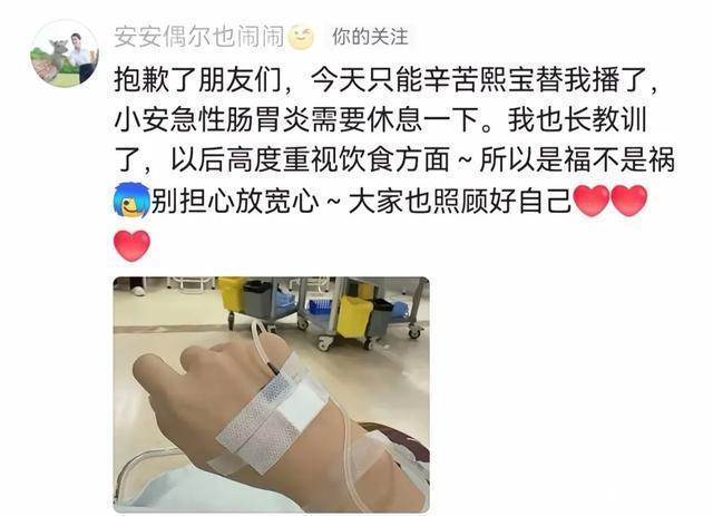 而突然生病去医院的安安,随后不久也现身评论区给大家留言说道“抱歉了朋友们,今天只能辛苦熙宝替我播了,小安急性肠胃炎需要休息一下。我也长教训了,以后高度重视饮食方面,所以是福不是祸别担心放宽心,大家也照顾好自己。”