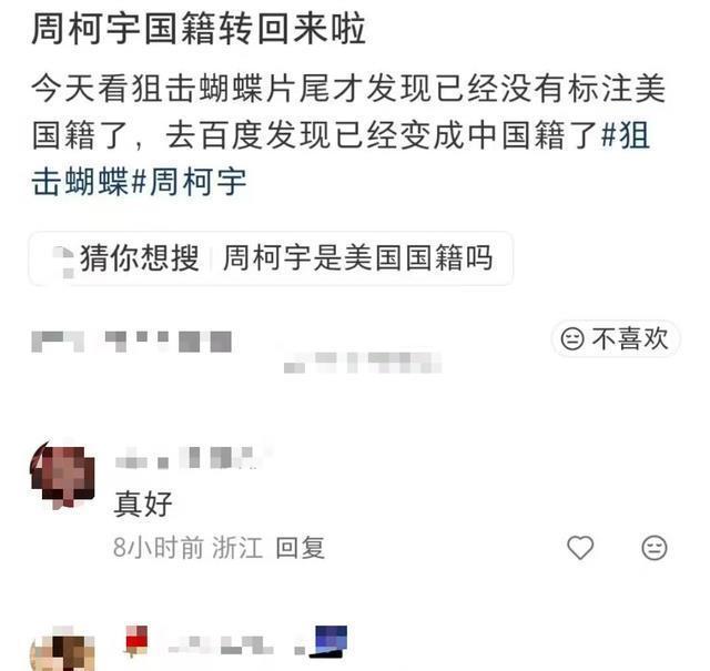 就在前几天,有眼尖的观众发现: 在周柯宇新剧《狙击蝴蝶》的片尾名单里。 原本规规矩矩跟在他名字后面的那两个字:(美国)不见了!