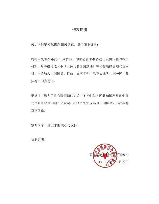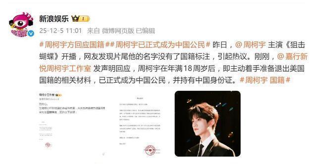 就在舆论升温的第二天,工作室一纸官方声明,干净利落地画上了句号: 周柯宇已依照法律程序,主动申请并完成了退出美国国籍的手续,目前法律身份为中国公民。